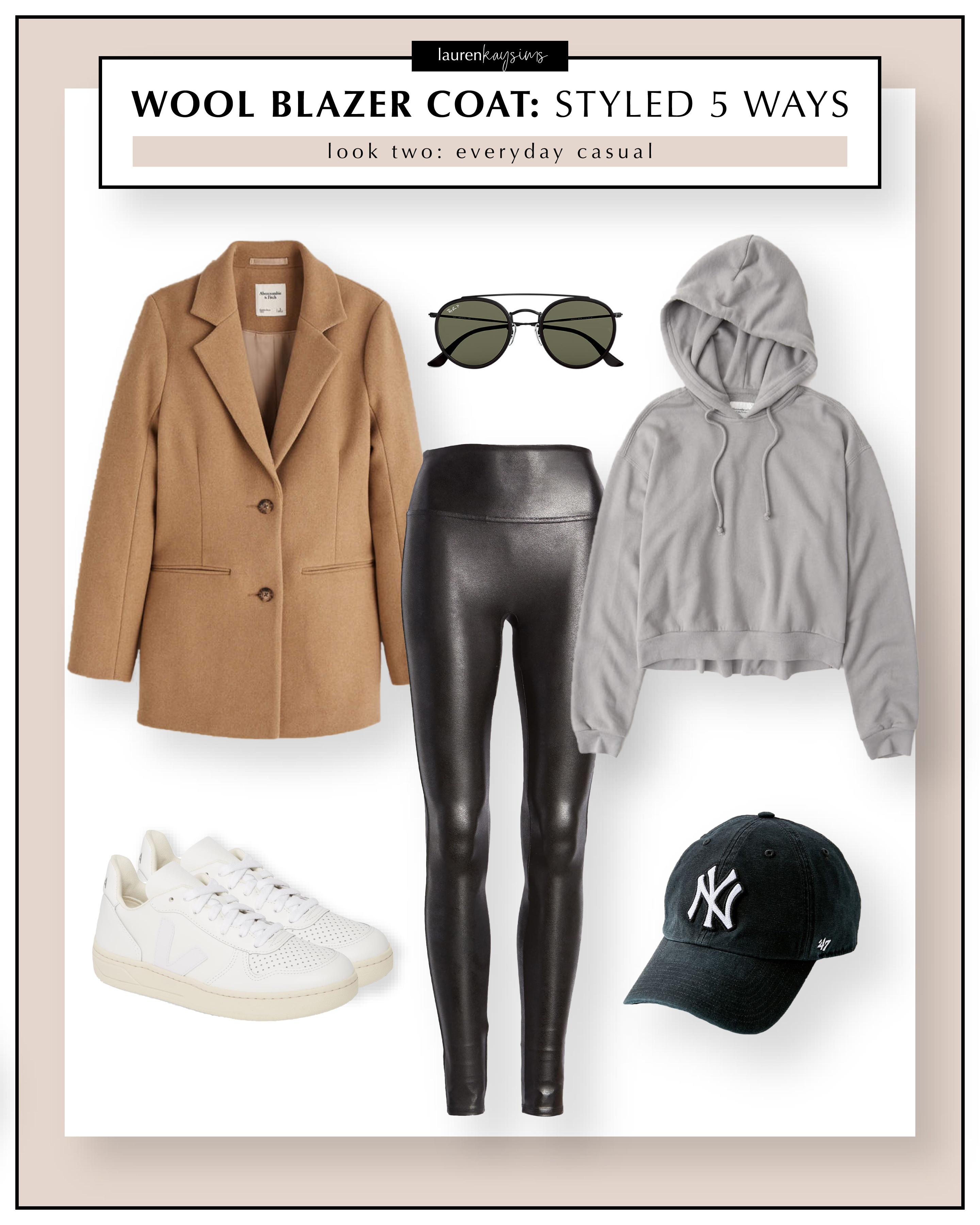 I love look 2 because you can keep the comfort without sacrificing the style! A blazer plus a baseball cap is the perfect menswear combo, in my book. I would wear this outfit to run errands, to brunch, on a casual date night… basically anywhere! These leather leggings are one of my most worn items for years now and I love how they look with this coat. You will definitely see me in this ensemble in the months to come!