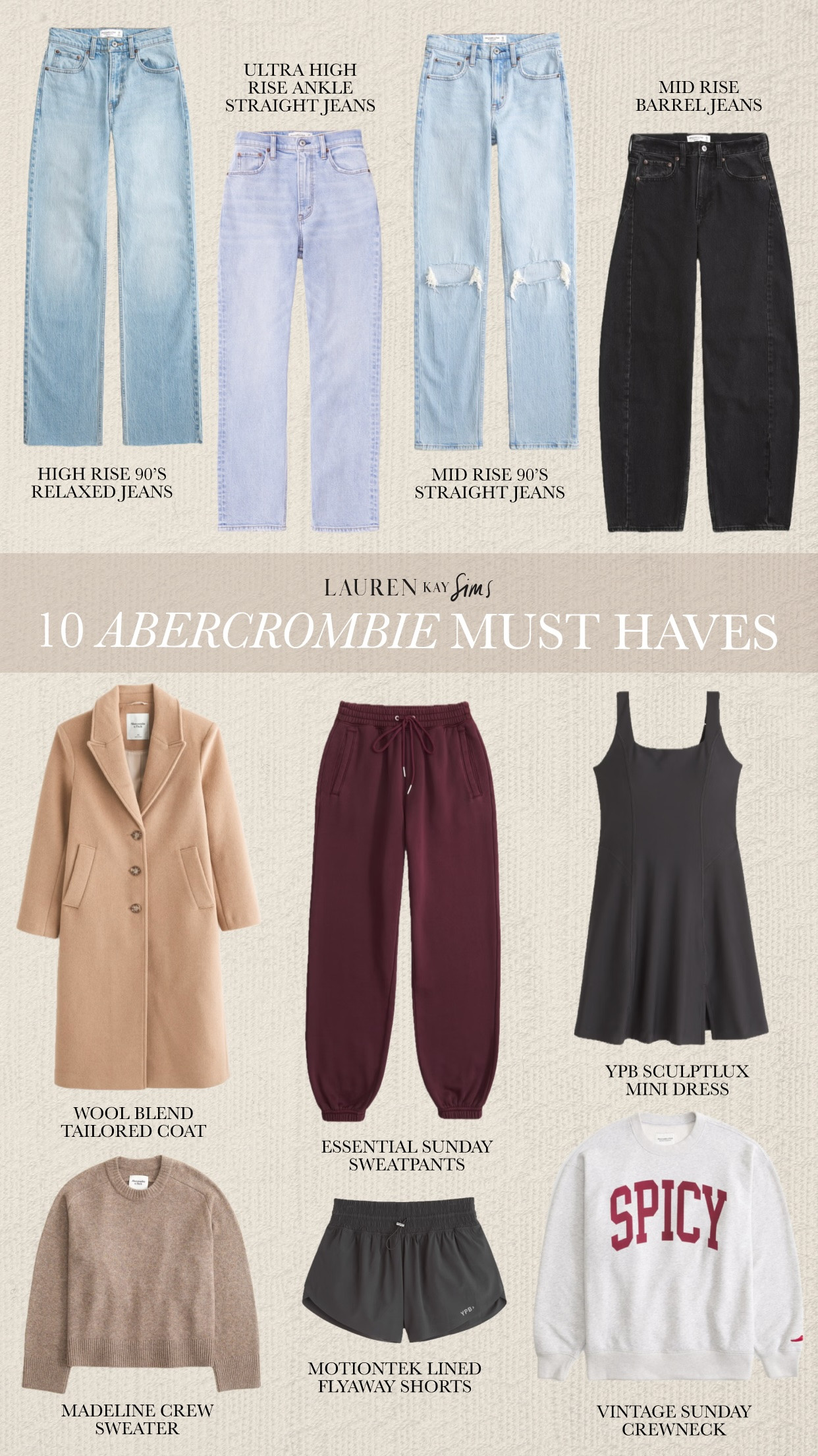 if you’ve been following me for a while (or really, longer than a day or two lol), you’ve probably realized 90% of my wardrobe is made up of abercrombie. i usually share a new arrivals try on haul about once a month on my stories, with a discount code (y’all can use code AFLAUREN today – sunday for 15% off!), but today i wanted to share with y’all my 10 staple abercrombie pieces, that i continue to come back to year after year. these are pieces in my close that i grab over & over again and that i recommend completely for every woman’s wardrobe!